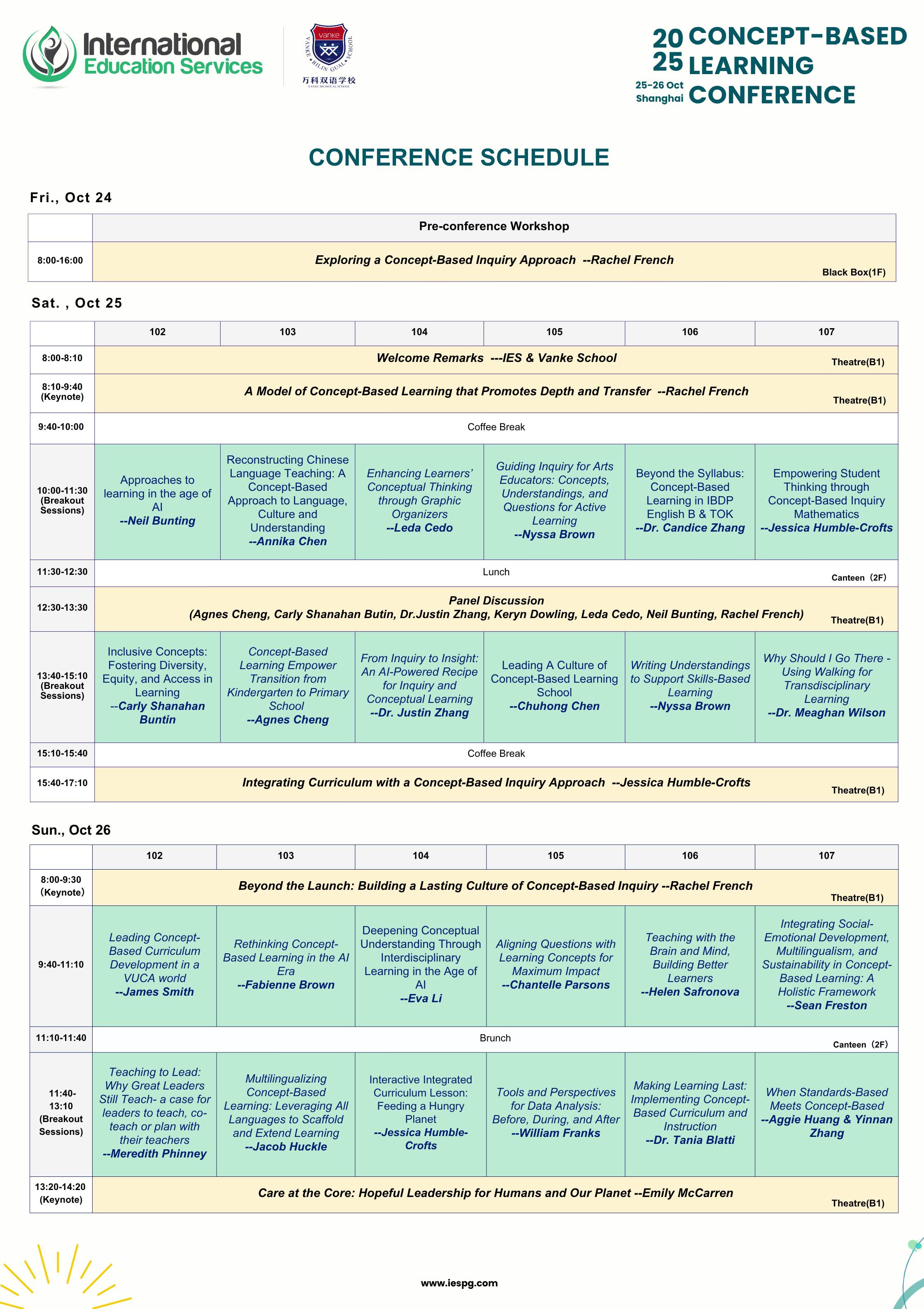 | Rethinking Concept-Based Learning in the AI Era | Teaching with the Brain and Mind, Building Better Learners | Multilingualizing Concept-Based Learning: Leveraging All Languages to Scaffold and Extend Learning | Leading Concept-Based Curriculum Development in a VUCA world |